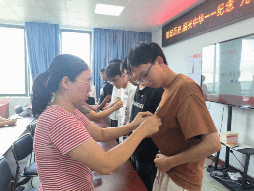 老党员代表、各学生支部书记为预备党员代表佩戴党徽