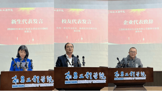 学院党委负责人夏志红、学院行政负责人唐刚、2024级机械制造与自动化专业新生代表查顺洁、2002级机电一体化专业校友代表袁志强、江西牧森自动化设备有限公司企业代表唐伟坤分别发言。(文/图 刘 欣)