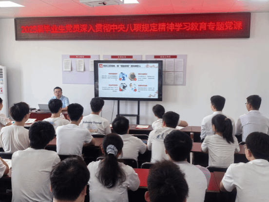 讲授一堂专题党课。学院党委书记罗斌在机电楼A406会议室面向全体毕业生党员讲授专题党课《扎实开展深入贯彻中央八项规定精神学习教育,以“清风正气”护航职业人生》。罗斌围绕中央八项规定精神的核心要义,为毕业生党员开展职场廉洁教育,强调严守纪律规矩、爱岗敬业、笃行实干、学术诚信的重要性。