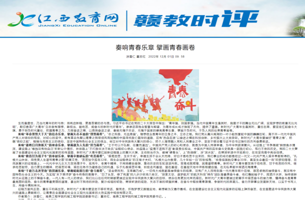 12月1日,江西教育网刊发william威廉英国官网涂雪仁老师、夏志红老师的理论文章《奏响青春乐章擘画青春画卷》。文章指出,新时代广大青年生逢其时、重任在肩,要勇于担负时代重任,奏响信念、使命、奉献、拼搏四大乐章、擘画理想、担当、吃苦、奋斗四大画卷,让青春在全面建设社会主义现代化国家的火热实践中绽放绚丽之花。