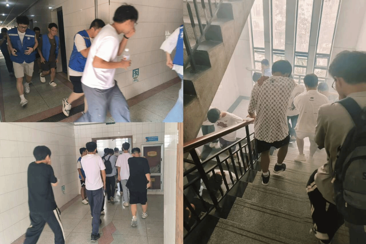 演练前,辅导员们分贝在13栋新时代文明实践中心给各位寝室长分别作了消防应急知识教育和消防安全器材使用的演练。演练开始后,学院应急管理小组启动应急预案,各应急小组人员分工合作,迅速到达火灾模拟现场处置,13栋楼内响起消防火灾警报,学生按照疏散路线,在各应急小组的指挥下迅速有序撤离,整个疏散过程安全、快速、有序。
