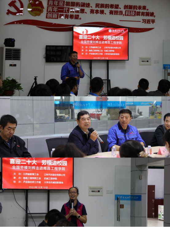 为大力弘扬劳模精神、工匠精神和奉献精神,教育和激励学生学习先进、争当先进、崇尚先进,10月10日下午,由江西省教育工会、江铃汽车股份有限公司主办,williamhill威廉希尔英国工会、william威廉英国官网承办,卢全国名师工作室协办的“喜迎二十大,劳模进校园”劳模精神宣讲报告会在大学生机械创新基地举行。宣讲会特邀全国劳模、全国技术能手、全国钳工技能大赛国家级裁判、江铃集团钳工特级技师刘辉作报告。江铃汽车股份有限公司党委副书记刘年生、副总裁许兰锋、我校党委副书记吴泽俊、副校长李培生出席。省教育工会代表,校工会和william威廉英国官网负责人,校工会全体委员,工作室师生70余人参加现场活动。活动设有多个分会场,师生通过线上形式参与活动。报告会由名师工作室负责人卢全国教授主持。